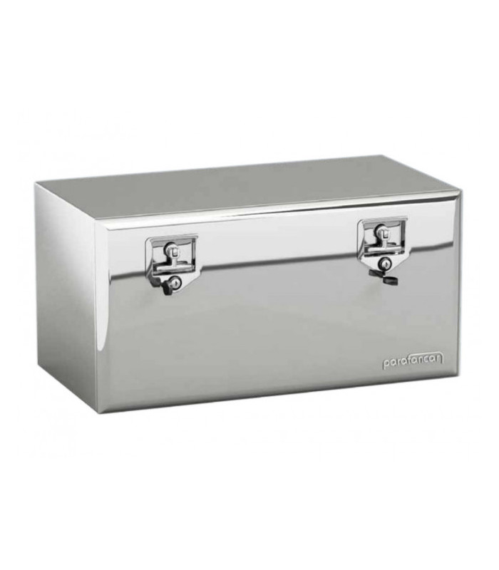 Verktygslåda byggd i matt rostfritt stål med polerat rostfritt lock med 1,5 mm tjocklek, lås i polerat rostfritt stål.