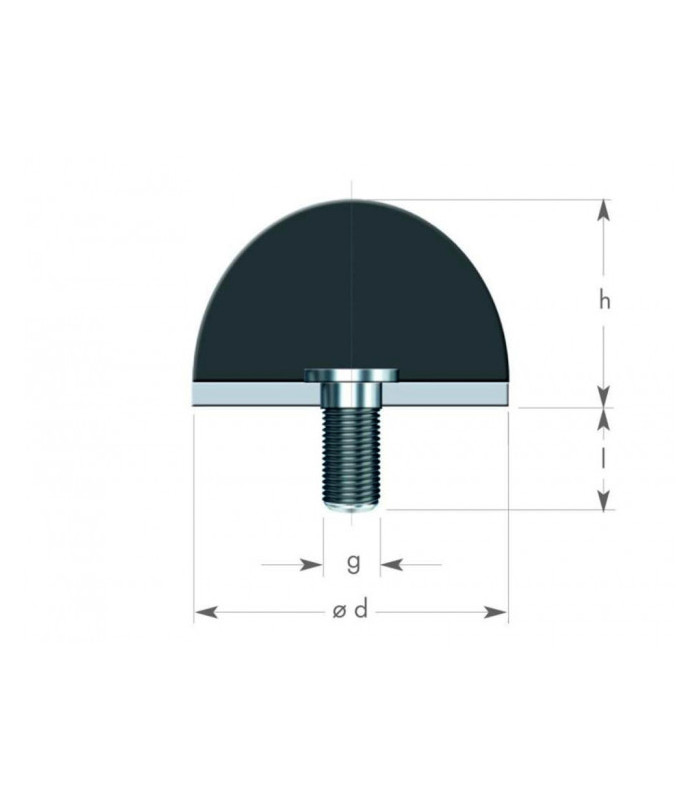 Ändstopp med bottenplatta i stål och gängad tapp. Konformat gummi.