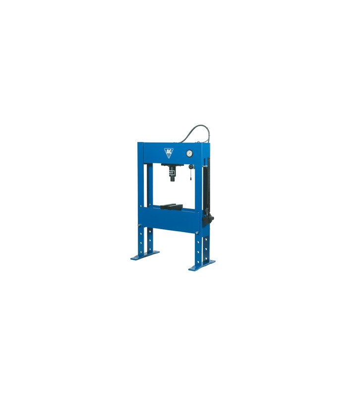 Handhydraulisk juniorpress till personbilsverkstäder och lätt industriFotbetjänad, tryckluftsstyrd snabbgång av presskolv för snabb och precis fixering av ämnet. Sidledes flyttbar cylinder. Inbyggd manometer i bekväm ögonhöjd. Inbyggd säkerhetsventil skyddar mot överbelastning. Helsvetsad ram och pressbord i stål av högsta kvalitet säkrar lång livstid....