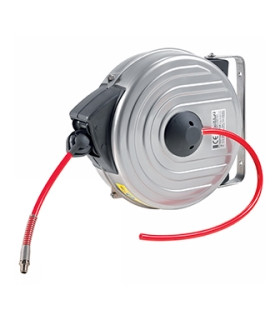 Plåtinkapslad vinda med returbroms. Utrustad med PU-slang och svängbart väggfäste.