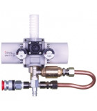 Tryckstegrande booster. Ger dubbelt så högt utgångstryck som ingångstryck. Utrustad med backventiler.