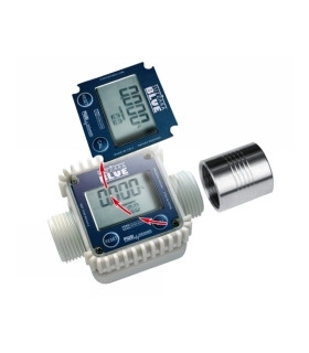 Digitalt mätverk. Femsiffrig mätare som är nollställbar. Med 1” inv/utv. gänga för anslutning. Totalräkneverket är 6-siffrigt. För spolarvätska, vatten och diesel.Max flöde 120 l/min. Max arbetstryck 20 bar.Arbetstemperatur -10 till +50 °C. Felvisning ± 1%. Drivs med 2 st AAA batterier. Vikt 0,4 kg. Mått: LxBxH 100x75x55 mm
