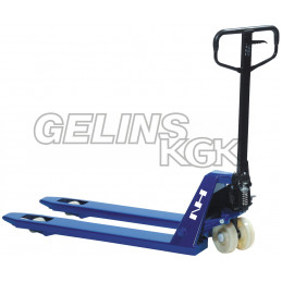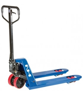 En driftsäker handtruck av högsta kvalitet och precision.Palltrucken har en av marknadens starkaste hydraulik.Boggihjul av polyuretan med ett litet klätterhjul längst fram, för att lätt kunna komma in under pallen från långsidan.