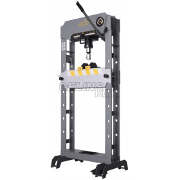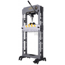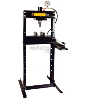 Handhydraulisk juniorpress till personbilsverkstäder och lätt industriFotbetjänad, tryckluftsstyrd snabbgång av presskolv för snabb och precis fixering av ämnet. Sidledes flyttbar cylinder. Inbyggd manometer i bekväm ögonhöjd. Inbyggd säkerhetsventil skyddar mot överbelastning. Helsvetsad ram och pressbord i stål av högsta kvalitet säkrar lång livstid....