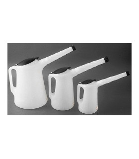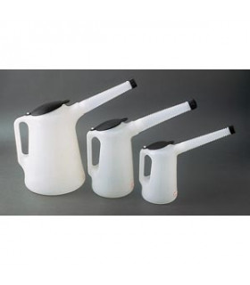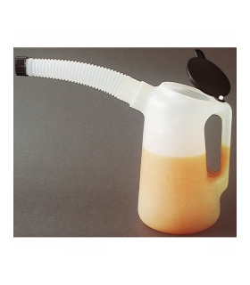 Oljemått, plast 2 liter Tillverkad av kraftig olje- och kemikaliebeständig plast. Behållaren är transparent, vilket gör det enkelt att se oljemängden. Böjlig pip, utrustad med lock för att förhindra smuts.
