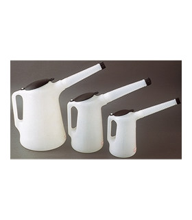 Oljemått, plast 5 liter Tillverkad av kraftig olje- och kemikaliebeständig plast. Behållaren är transparent, vilket gör det enkelt att se oljemängden. Böjlig pip, utrustad med lock för att förhindra smuts.