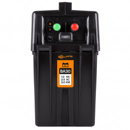 Batteriaggregatet BA30 kan förse ett stängsel på upp till 4 km med ström.(+ Gratis 9 volts batteri)Specifikationer:- Max. utspänning (V): 9600- Laddningsenergi (J): 0,25- Maximal impulsenergi (J): 0,19- Antal jordspjut som krävs: 1 x 0,5 m- Utan vegetation (km) (rekommendation): 4- Lätt veget