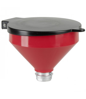 Spilloljetratt med lockTrattdiameter 250 mm. Volym 3,2 liter. Fatgänga 2”.Idealisk för att fylla spillolja i plåtfat.Tillverkad i plast med fatgänga i aluminium.Extra tillbehör:Går att använda till plastfat med adapter art. nr 85036011.