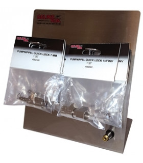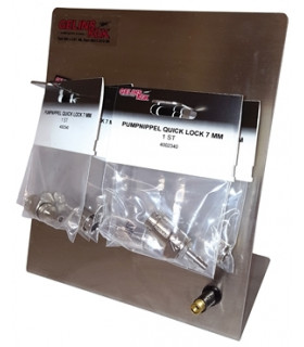 Ställ med:5 st 4002340 7 mm5 st 4002343 1/4” inv. Pumpnippel för bilventil. Friblåsande med snabbkopplingslåsning som gör att den tätar exakt mot ventilen.