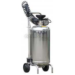 Rostfri koncentratspruta på hjul. Koncentratspruta som tål de flesta medel, men ej klor, svavelsyra eller saltsyra. Ämnen inom surhetsområdet PH-värde < 5 samt lösningsmedel och starkt frätande ämnen får ej fyllas i behållaren.