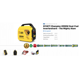 The Mighty Atom är världens lättaste 2200W Inverterelverk - nu även i Dual-Fuel utförande! Bäst i test! Läs mer HÄR Nu har vi förenat både lätt vikt, design och hög kvalité i ett elverk. Vårt nyaste inverterelverk Champion 2200W väger in på endast 17,9 kg och drivs av vår nyutvecklade Champion 79cc-motor. Förutom lätt vikt få du en drifttid på upp till...