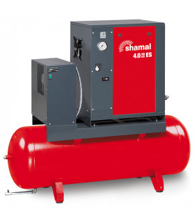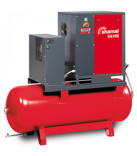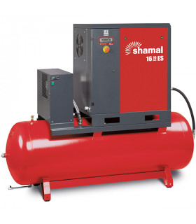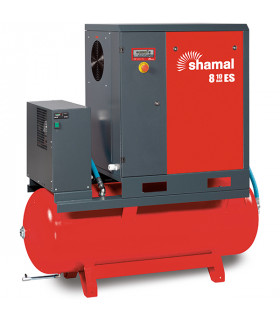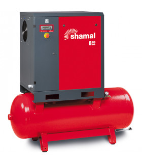 Skruvkompressor med tank och kyltork från Italienska Shamal. Shamal är sedan över 50 år ett väletablerat italienskt industriföretag specialiserat på produktion av ett brett sortiment av luftkompressorer avsedda för verkstad och industriell användning.