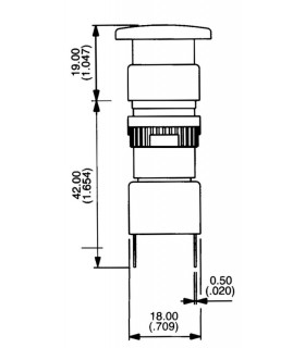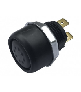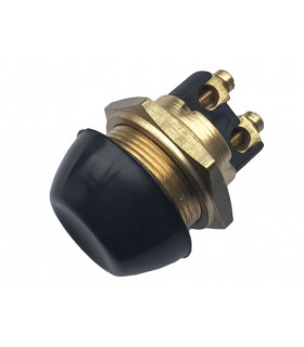 Strömbrytare av mässing med silverstift och gummikåpa. Håldiameter 22,5 mm. Kapslingsklass IP54 = skydd mot överstrilning av vatten. 1 s - 400 W, 6 V-24 V. 2 min - 250 W, 6 V-24 V.