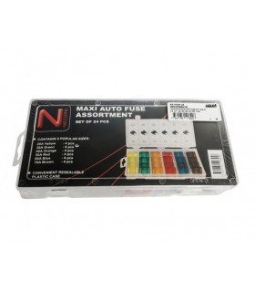 Säkringssortiment för MAXI Plug-in säkringar. Innehåller: 25st MAXI Plug-in säkringar mellan 20 och 80 amp. och 1st säkringsverktyg.