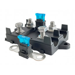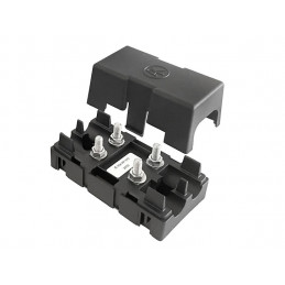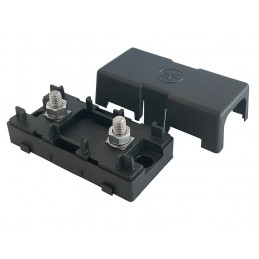För MEGA®-säkringar upp till 500 A. Totallängd 120, bredd 40 mm. Exkl. säkring. Clips och 2 st M8 bultar håller säkringen på plats. Kan byggas ihop till plint.