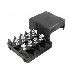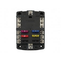 Säkringshållare för 6 säkringar, Konsoliderar grenkretsar och säkringar. Funktioner:• Positiv distributionsbuss med nr 10-32• Kan användas för 24-timmars kretsar• Skyddet uppfyller ABYC / USCG-kraven för isolering, innehåller en lättöppnad tryckknappsspärr som ger enkel åtkomst