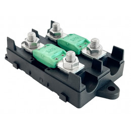 - Säkringshållare för bultsäkringar 2-fack, Typ SF51 enl. ISO 8820-5 (MEGA) - Bultmaterial: rostfritt stål - Bultar: M8 x 16 - Två monteringshål med 85 mm CC - Muttrar och brickor är färdigmonterade - Max åtdragningsmoment: 20 Nm - Material i svart hårdplast - Över- och underdel