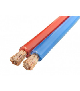 Mantel av köldbeständig transparent PVC. Olje-, syra- och värmebeständig. Temperaturområde -25°C till +70°C. Används t.ex. som laddningskabel för batterier. Färg: Blå/röd. Tvillingkabel med extra mångtrådig kopparledare. Pris per meter.