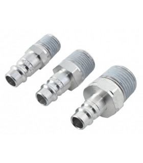 Hankoppling med utvändig gänga. Tryckluftsanslutningar av metall. Max arbetstryck 35 bar, min sprängtryck 140 bar. Temp.område -30°C - +100° C