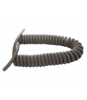 Spiralkabel 7-ledare med kabelarea 6x1,0 mm² + 1x2,0 mm². Effektiv arbetslängd 3 meter. Diameter spiral 45 mm. Diameter kabel 13 mm. Färg på innerledare: gul, röd, grön, svart, blå och brun (1,0 mm²) resp. vit (2,0 mm²). Ytterhölje i grå TPE (Termoplastisk Elastomer).