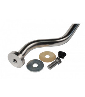 Skärmstag, rostfritt, bockat. Längd 750 mm, rördiameter 32 mm. Invändig gänga M16. Levereras komplett med plastplugg, bricka, bult och PUR-bricka.