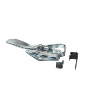I obehandlat alternativt galvaniserat utförande med låsögla. Låset säkras i låst läge med fjäderbelastad spärrhake med låsögla. Plattans längd 130 mm och bredd 90 mm. Totallängd 210 mm. Levereras utan svetsbygel.