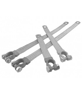 Av förtennad koppartrådsfläta med fastpressad negativ batterikabelsko av förtennad mässing. Bredd 23 mm.