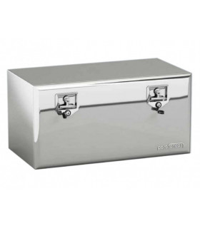 Verktygslåda byggd i matt rostfritt stål med polerat rostfritt lock med 1,5 mm tjocklek, lås i polerat rostfritt stål.