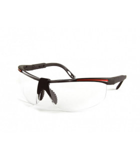 Med svart båge och klar lins i polykarbonat. Mjuk orange dämpning vid näsan. Skalm är justerbar i längd och går att vinkla. Rep- och imfri.