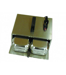 Värmeugn med ytterhölje, front och lucka i rostfri blankpolerad plåt. För 2 st matlådor. Uppvärmningstid ca 30 min. Stickkontakt som passar både cig.uttag och DIN-uttag medföljer. Matlådor ingår ej. 50 W. Välj mellan 12 V och 24 V.