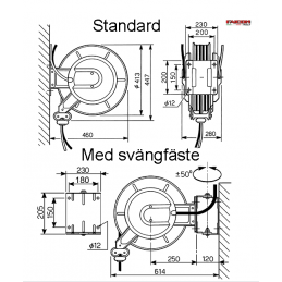 Luft, 20 bar Slangvindorna är kapslade och tillverkade av stål. Slangen är av polyuretan och mjuk även vid låga temperaturer. De är utrustade med returfjäder. Vindorna levereras med svängbart väggfäste.