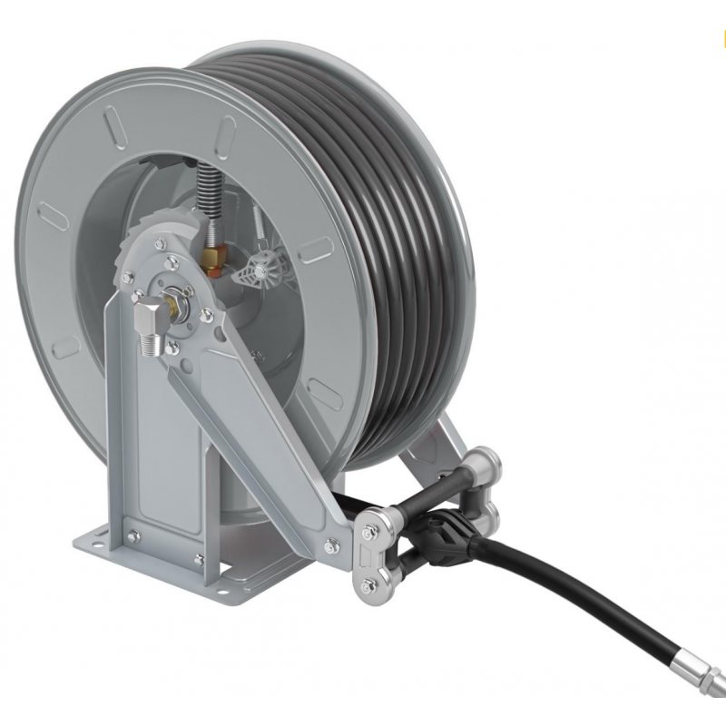 Luft, 20 bar Slangvindorna är kapslade och tillverkade av stål. Slangen är av polyuretan och mjuk även vid låga temperaturer. De är utrustade med returfjäder. Vindorna levereras med svängbart väggfäste.