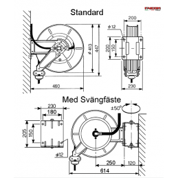 Luft, 20 bar Slangvindorna är kapslade och tillverkade av stål. Slangen är av polyuretan och mjuk även vid låga temperaturer. De är utrustade med returfjäder. Vindorna levereras med svängbart väggfäste.