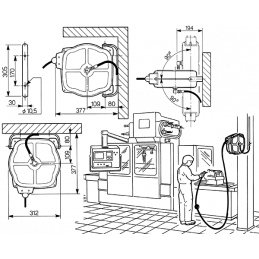 Luft, 20 bar Slangvindorna är kapslade och tillverkade av stål. Slangen är av polyuretan och mjuk även vid låga temperaturer. De är utrustade med returfjäder. Vindorna levereras med svängbart väggfäste.