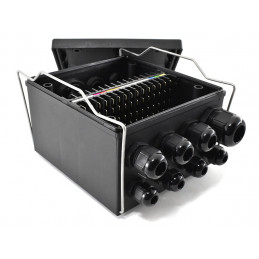Av svart plast i vattentätt utförande. Bestyckad med 15-polig kopplingsplint med 4 + 4 flatstiftsanslutningar per pol. 16 st kabelingångar (10 x PG9 + 5 x PG13 + 1 x PG16 monterade). Storlek 167 x 157 mm. Höjd 99 mm. Finns även i en version med extra gummitätningar, special samt special med 2047.03