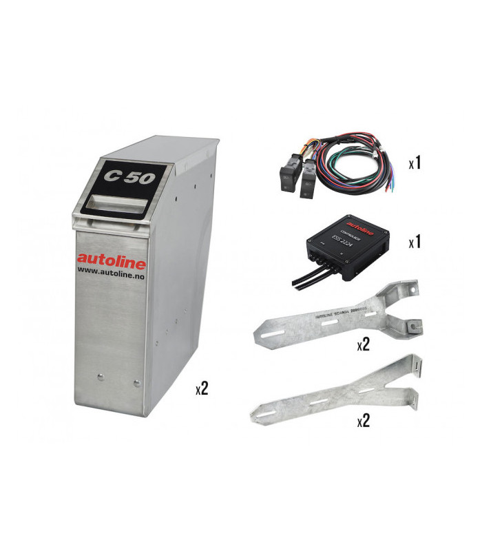 S90 sandspridarkit Scania. Innehåller: 2 x A90001 Sandspridare S90M utan fäste 2 x A10000 Fäste standard Autoline 2 x A2896005 Fäste Scania vänster/höger 1 x A402024610 Styrcentral/Controlbox ESS2224 6m kabel 1 x A4098426 Kablage Scania NCG 2016 delad