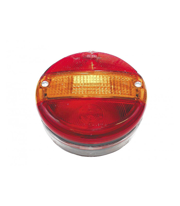 Baklampa med back-, dim-, bak-, broms-, blinkers, positionsljus och sidomarkering, reflex i glaset. PG21-ingång på baksidan. Med skyltbelysning.