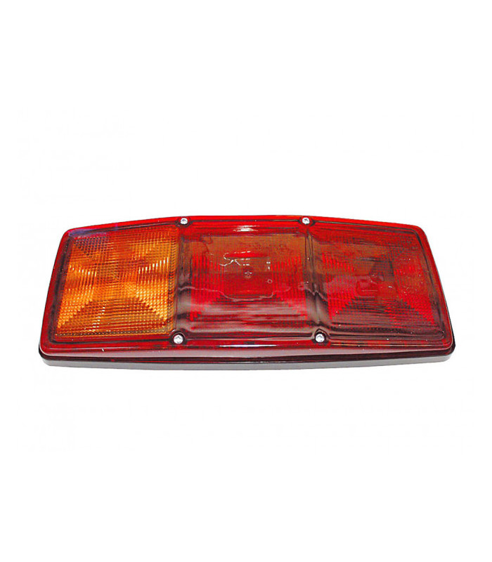 Baklampa med back-, dim-, bak-, broms-, blinkers, positionsljus och sidomarkering, reflex i glaset. PG21-ingång på baksidan. Med skyltbelysning.