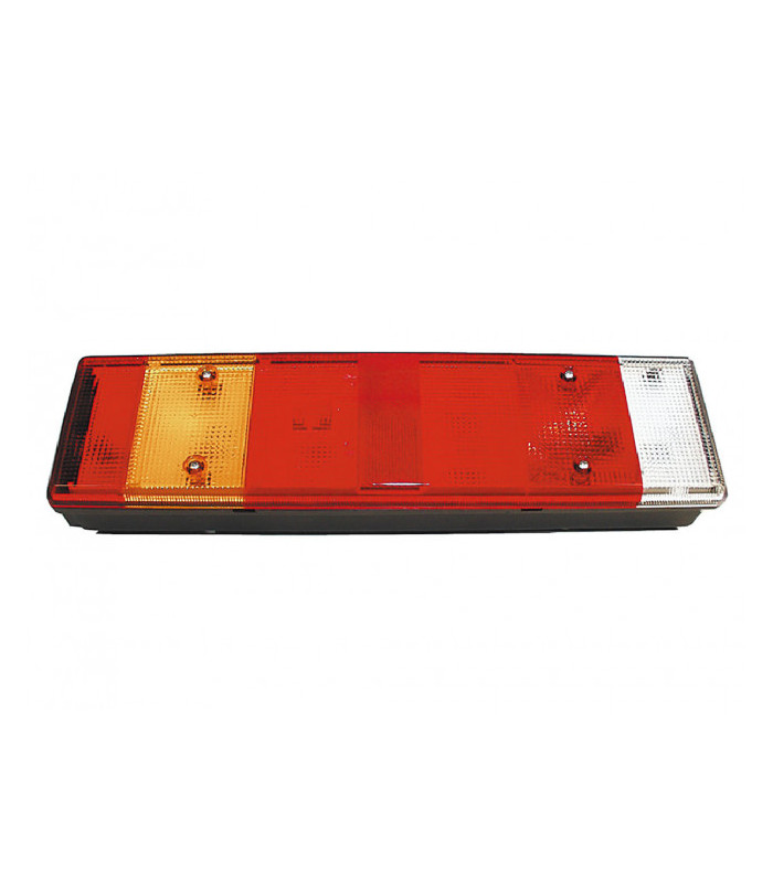 Baklampa med back-, dim-, bak-, broms-, blinkers, positionsljus och sidomarkering, reflex i glaset. PG21-ingång på baksidan. Med skyltbelysning.