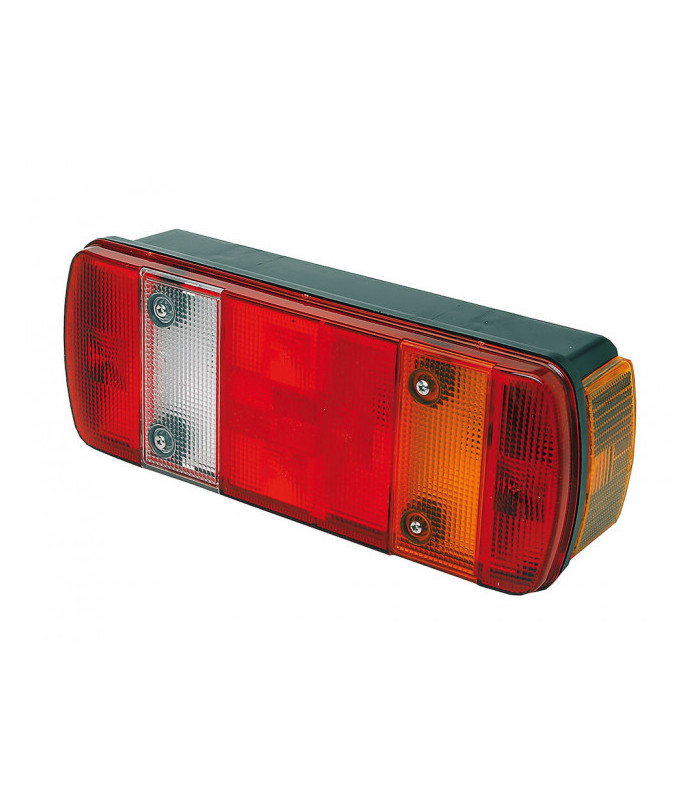Back-, dim-, bak-, reflex-, broms-, blink- och positionslampa samt sido- markeringslampa med reflex. 7-stifts sidomarkerad DIN-kontakt som kabel- anslutning. Finns i höger- och vänsterutförande samt vänsterutförande med skyltbelysning. M8 fästbultar.