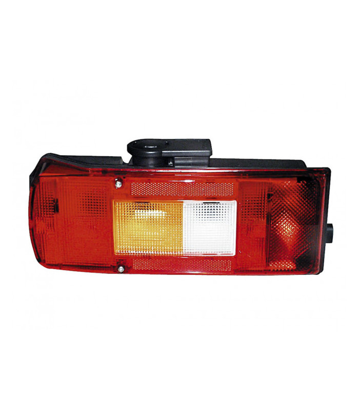 Back-, dim-, bak-, reflex-, broms-, blink- och positionslampa samt sido- markeringslampa med reflex. 7-stifts sidomarkerad DIN-kontakt som kabel- anslutning. Finns i höger- och vänsterutförande samt vänsterutförande med skyltbelysning. M8 fästbultar.