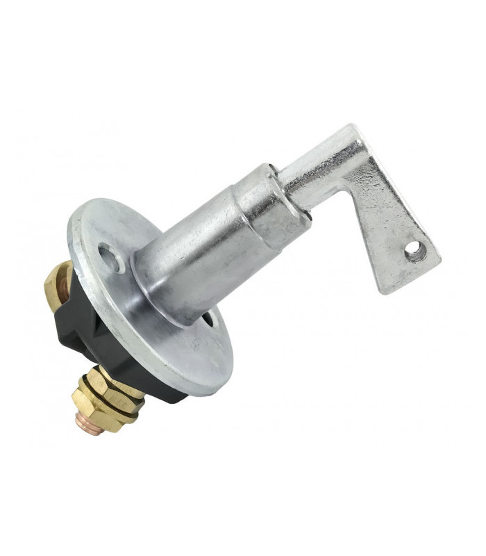 Batterifrånskiljare av termoplast. Kapacitet: 100 A, 500 A upp till 5 sekunder. Diameter 57,5 mm, bultar M10. CC 38 mm, fästhål 7 mm. Levereras med nyckel.