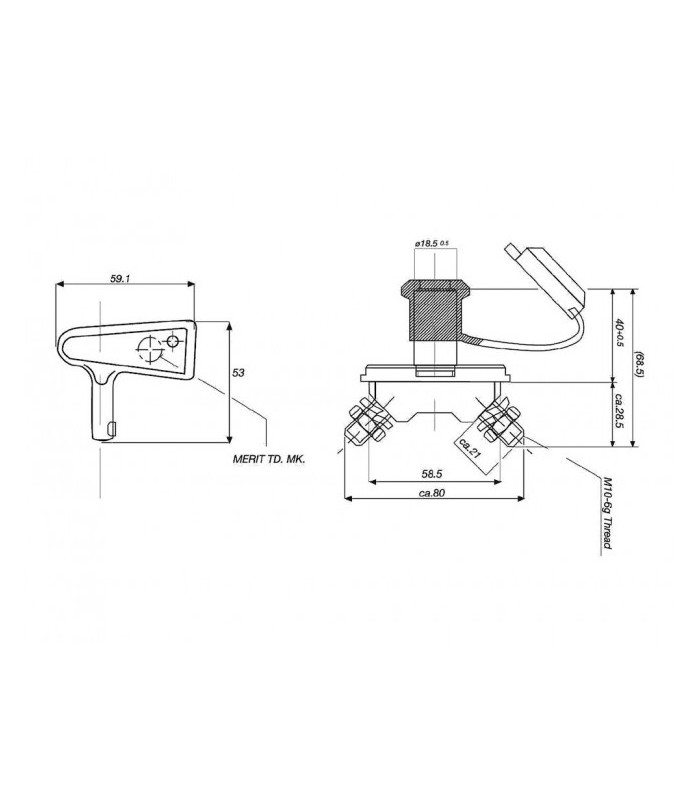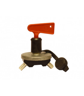 Batterifrånskiljare av termoplast. Kapacitet: 100 A, 500 A upp till 5 sekunder. Diameter 57,5 mm, bultar M10. CC 38 mm, fästhål 7 mm. Levereras med nyckel.