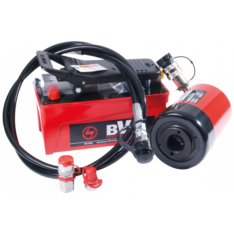 Hålcylinder HC3002T 30 ton med luftdriven fotpump PA1500, slang 2 m och snabbkoppling. Ett paket som alla borde ha som vill sköta sina maskiner på verkstaden eller i fält. Detta paket är perfekt när du skall byta bultar eller bussningar på din maskin.
