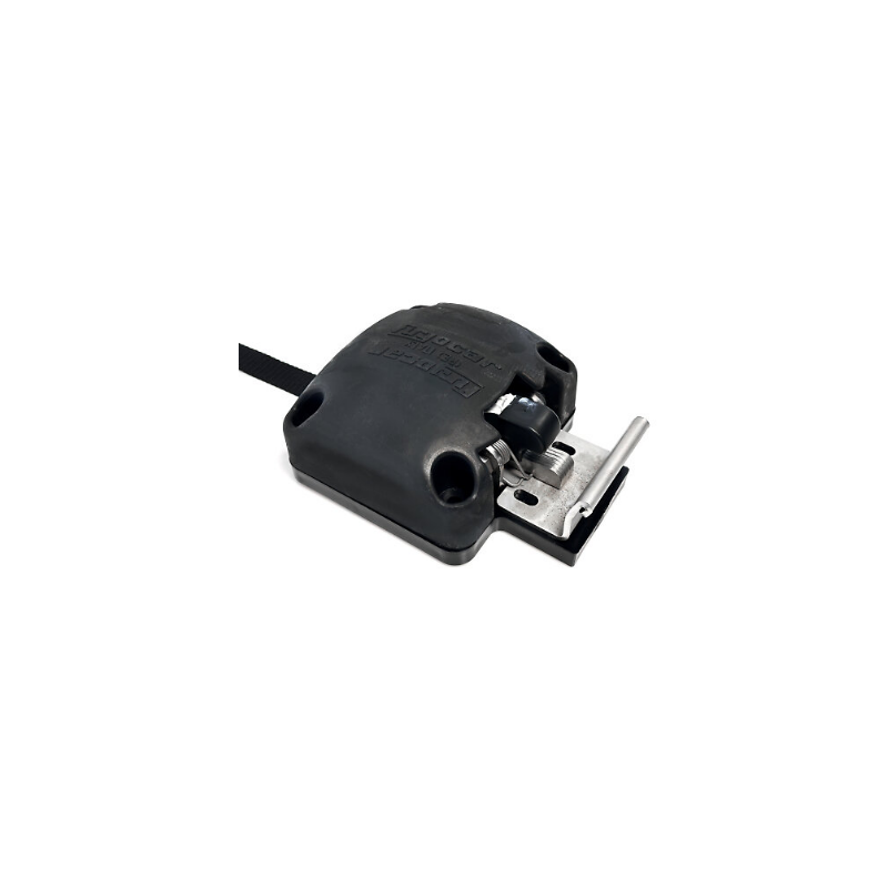 Fjäderbelastad dörrstopp med 3 lägen, plasthandtag. För montering på chassi. Underhållsfri, smörjd under montering.