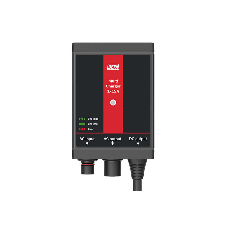 DEFA MultiCharger 1x12A passar batteristorlekar upp tilll ca 150Ah och kan underhållsladda batteriet under obegränsad tid. Laddarna klarar parallell belastning upp till 6A från annan förbrukare samtidigt som den laddar. Laddningsspänningen är temperaturkompenserad med extern sensor.