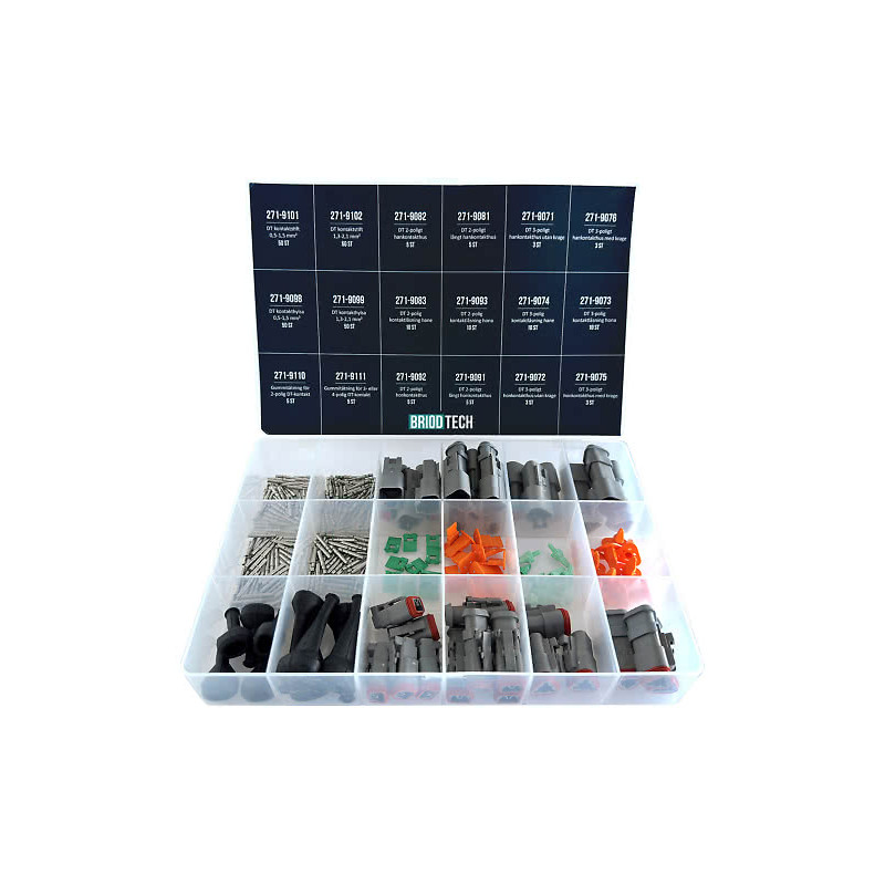 Ny sortimentslåda med Deutsch kontakter 2-3-poliga.Lådan innehåller 18 artiklar ca 300 delar. Pressverktyget är en ratchettång med inbyggd returspärr som garanterar att kontaktpressningen fullföljs. Nedanstående artiklar finns med i lådan:271-9101 DT kontaktstift 0,5-1,5 mm² <