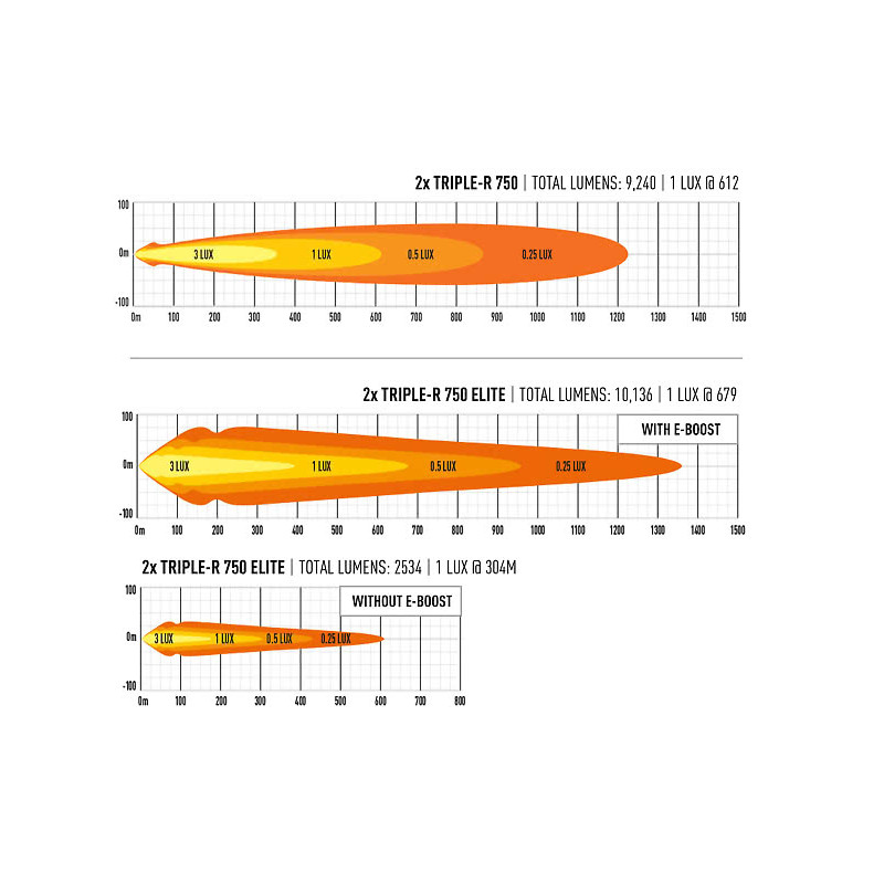 Med den senaste LED-tekniken och optimerad optik levererar Triple-R-serien en imponerande distansbelysning och Elite-serien har en effektfull ljusspridning även på bredden så att hela vägen lyses upp långt framåt. Den relativt låga upp/ned -spridningen av ljus säkerställer att lamporna är lämpliga vid takmontering och undviker reflekterande bländning från fordonets motorhuv.