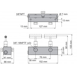Fördelningsblock med 2 st inbyggda ventiler, 3 x 3/8"NPTF. Max arbetstryck 700 bar.