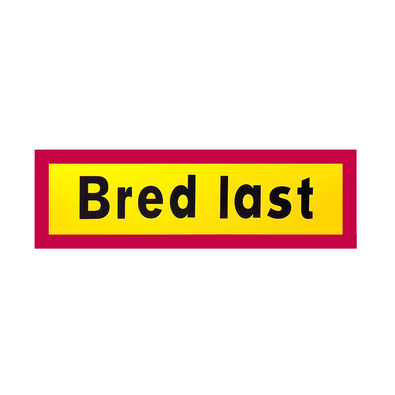 Bred Last skylt enligt de nya föreskrifterna från Transportstyrelsen. Bred lastskylt med bård, fluorescerande och gult reflekterande 2-radig 600x500x2 mm. Material: Aluminium. Utdrag ur TSFS 2023:36Fordon eller fordonståg som transporterar bred odelbar last ska framtill och baktil